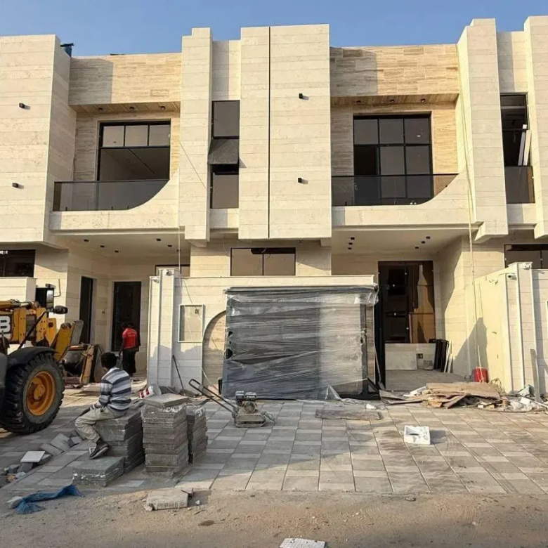 Townhouse for sale in Ajman in a prime location, including registration and ownership fees, at a bargain price (negotiable). It consists of three floors: ground, first, and roof. It features four master bedrooms with built-in wardrobes, a majlis (formal sitting room), a living room, a roof terrace, a main kitchen, and a preparation kitchen. The villa boasts a prime location, excellent finishes, a spacious building area, and freehold ownership for all nationalities.